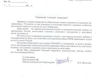 Примите от имени коммунистов Кыргызстана самые искренние и сердечные поздравления с 70-летием со дня рождения и пожелания крепкого здоровья, стойкости, неутомимой энергии и успехов во всех начинаниях.