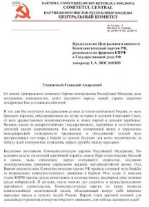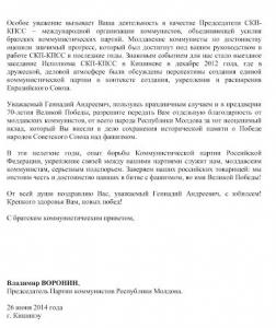 Уважаемый Геннадий Андреевич, пользуясь праздничным случаем и в преддверии 70-летия Великой Победы, разрешите передать Вам отдельную благодарность от молдавских коммунистов, от всего народа Республики Молдова за тот неоценимый вклад, который Вы внесли в дело сохранения исторической памяти о Победе народов Советского Союза над фашизмом.