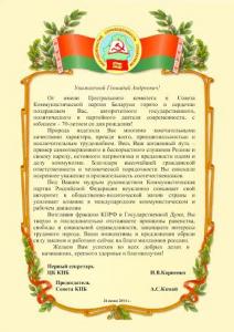 От имени Центрального комитета и Совета Коммунистической партии Беларуси горячо и сердечно поздравляем Вас, авторитетного государственного, политического и партийного деятеля современности, с юбилеем – 70-летием со дня рождения!
