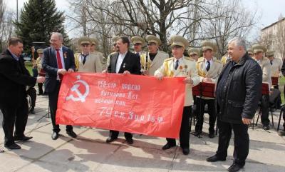 Казбек Тайсаев и Владимир Родин под звуки марша вручили Знамя Победы районной партийной организации, а также наградили ветеранов партии, дирижера оркестра «Шахтерские зори» Александра Коренева памятной медалью «70 лет Великой Победы».