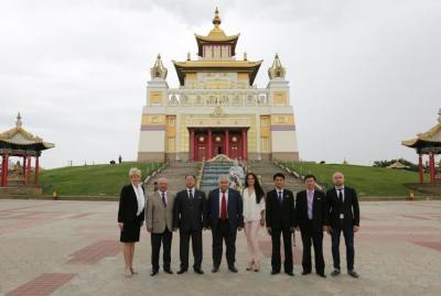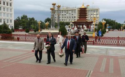 После торжественного возложения цветов к памятнику Владимиру Ильичу Ленину корейские товарищи осмотрели достопримечательности центральной площади столицы Калмыкии – Пагоду Семи дней с каскадом фонтанов, посетили самый крупный в Европе буддийский храм «Золотая обитель Будды Шакъямуни».