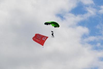 прыжками спортсменов-парашютистов с флагами, а также за захватывающими