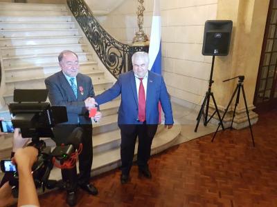 На торжественном приеме, устроенном по случаю Конференции нашим посольством в Мексике, депутат Госдумы К.К. Тайсаев в торжественной, дружеской обстановке, под аплодисменты участников форума, от имени Геннадия Андреевича Зюганова, всех членов фракции КПРФ в Госдуме вручил Э.Р. Малаяну памятную медаль в честь 100-летия Великой Октябрьской социалистической революции. Так была отмечена его огромная работа по отстаиванию интересов Российской Федерации в Мексике. Медаль была принята с особой признательностью и благодарностью.