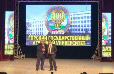 По завершении приветствия, за добросовестный труд, значительный вклад в развитие кадрового потенциала агропромышленного комплекса Российской Федерации и в связи со 100-летием со дня открытия университета, Казбек Тайсаев от имени Заместителя Председателя ЦК КПРФ, академика РАН, председателя комитета Государственной Думы по аграрным вопросам Владимира Ивановича Кашина передал почетную грамоту коллективу Горского государственного аграрного университета и наградил высшей партийной наградой «Орденом дружбы» ректора университета Темираева Виктора Хамицевича. Также была вручена высшая награда Международного организационного комитета «Комсомолу -100» орден «Комсомольская доблесть» Ваниеву Асланбеку Георгиевичу, Донской Наталье Петровне, Лазарову Таймуразу Константиновичу.