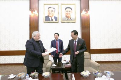 В начале встречи Казбек Тайсаев поздравил северо-корейских товарищей с наступающим Новым Годом (Чучхе), а также передал приветственные слова от Председателя ЦС СКП-КПСС, Председателя ЦК КПРФ, Руководителя фракции КПРФ в Государственной Думе Зюганова Геннадия Андреевича.