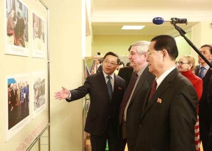 Затем делегация проследовала в фойе второго этажа старого здания Государственной Думы, где располагалась выставка «История дружбы», посвященная 70-летию заключения Соглашения об экономическом и культурном сотрудничестве между СССР и КНДР. Инициаторами данной выставки стала Коммунистическая партия Российской Федерации во главе с Г.А. Зюгановым, при сотрудничестве Посольства КНДР в Российской Федерации.