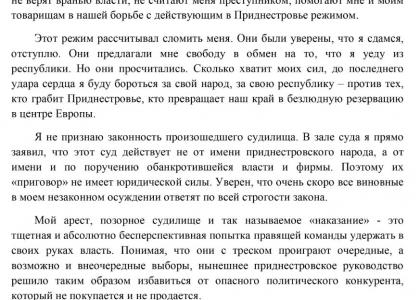 Обращаясь к Вам, я хочу, в первую очередь, поблагодарить Вас за Вашу поддержку, за теплые слова, за Вашу помощь. Для меня очень важно то, что подавляющее большинство граждан Приднестровской Молдавской Республики не верят вранью власти, не считают меня преступником, помогают мне и моим товарищам в нашей борьбе с действующим в Приднестровье режимом.