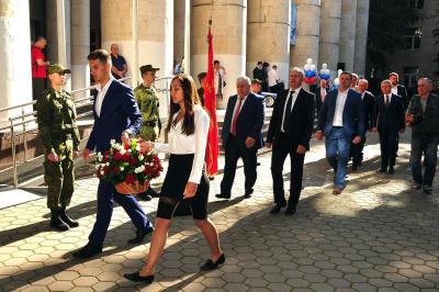 После приветствия, посвященного началу учебного года, почетные гости возложили цветы к памятнику Учителю - символу почитания и уважения великому призванию - преподаватель Университета!