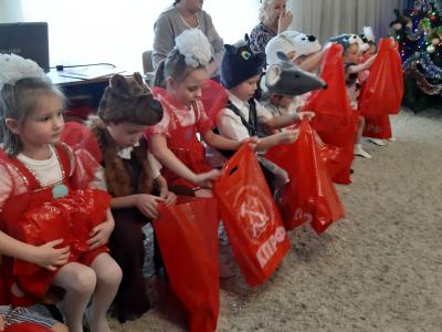 Эти ребята почти не смотрели на светящуюся гирляндами, украшенную шарами елку. Даже танцевали в хороводе они как-то напряженно. А вот сладкие подарки в красивых коробках, упакованные в красные пакеты с символикой КПРФ, они восприняли с радостью.