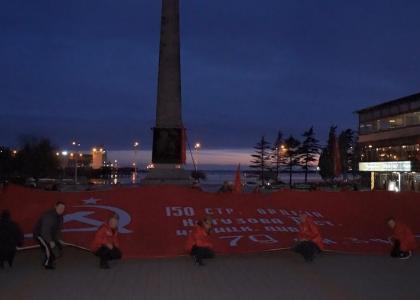 Затем участники марша переместились к памятнику Неизвестному солдату и поклонились ему, а также почтили память павших героев у Вечного огня. Уже в сумерках на площади у обелиска, посвященного борцам за Власть Советов, было развернуто полотнище копии Знамени Победы.