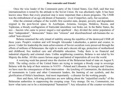 We, the leaders of the eighteen Communist parties of the former Soviet republics, at this difficult moment appeal to all the Communist and workers' parties of the world to provide all-round assistance to our Belarusian brothers!