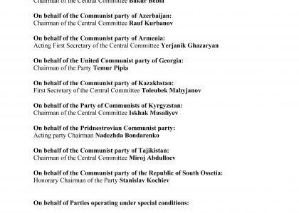 Nosotros, los líderes de los diecisiete partidos comunistas de las ex repúblicas soviéticas, unidos en la Unión de Partidos Comunistas, el PCUS, en este difícil momento apelamos a todos los partidos comunistas y obreros del mundo con un llamamiento para brindar asistencia integral a nuestros hermanos bielorrusos!
