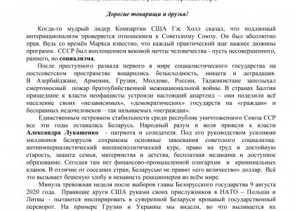 A worrying week has passed since the election of the Belarusian head of state on August 9, 2020. The ruling circles of the United States are trying to instigate a bloody coup in sovereign Belarus with the help of their minions in NATO – Poland and Lithuania. In Georgia and Ukraine, we have seen the consequences of their intervention – the lynching of Communists, the destruction of monuments to Lenin and other Communist leaders, the banning of our symbols, and the glorification of Hitler's henchmen. And most importantly - a disaster for the working people.