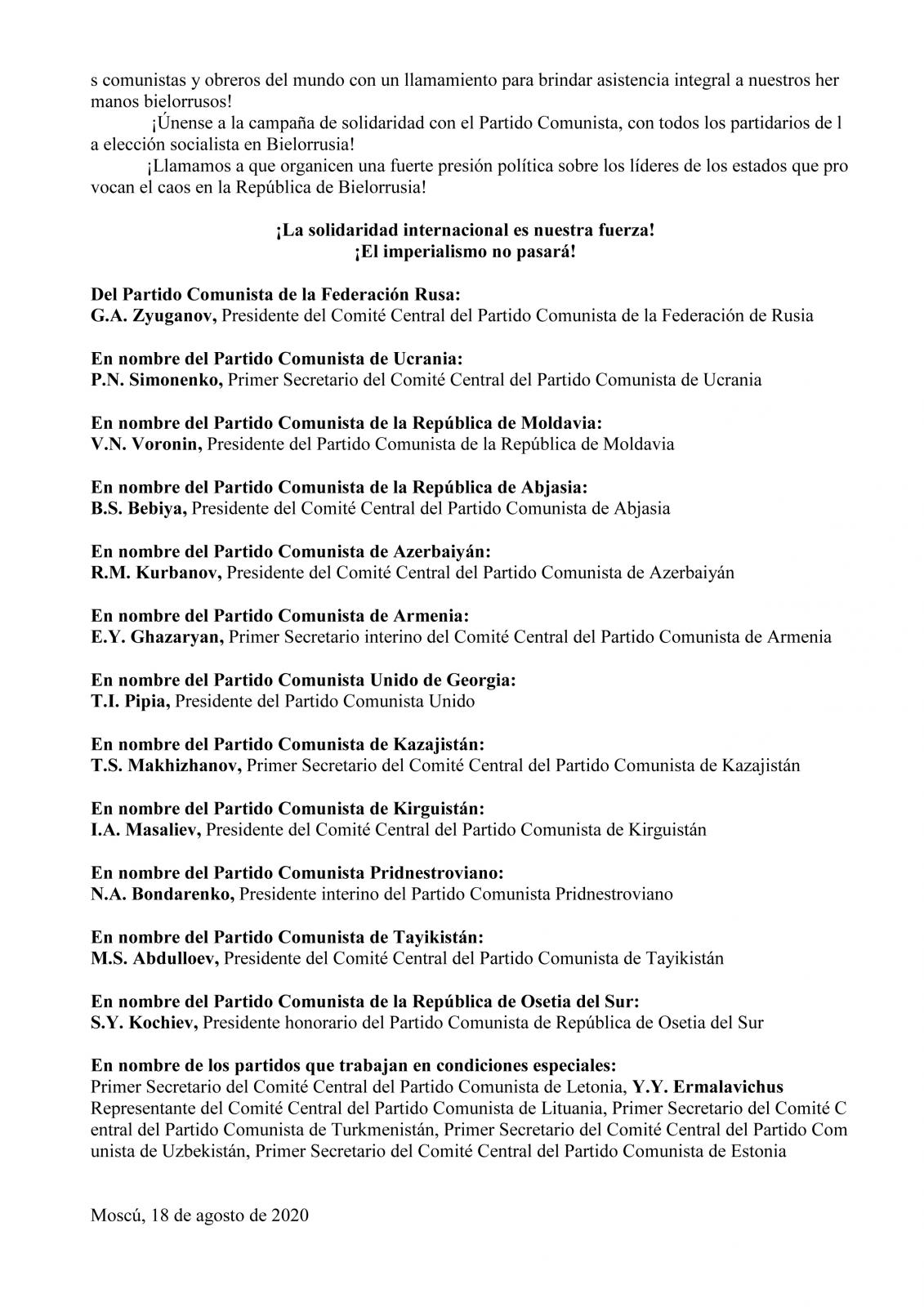 Nosotros, los líderes de los diecisiete partidos comunistas de las ex repúblicas soviéticas, unidos en la Unión de Partidos Comunistas, el PCUS, en este difícil momento apelamos a todos los partidos comunistas y obreros del mundo con un llamamiento para brindar asistencia integral a nuestros hermanos bielorrusos!