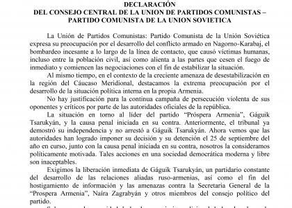 La Unión de Partidos Comunistas: Partido Comunista de la Unión Soviética expresa su preocupación por el desarrollo del conflicto armado en Nagorno-Karabaj, el bombardeo incesante a lo largo de la línea de contacto, que causó víctimas humanas, incluso entre la población civil, así como alienta a las partes que cesen el fuego de inmediato y comiencen las negociaciones con el fin de estabilizar la situación.