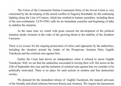 The Union of the Communist Parties-Communist Party of the Soviet Union is very concerned by the developing of the armed conflict in Nagorny Karabakh, by the continuing fighting along the Line of Contact, which has resulted in human casualties, including those of the non-combatants. UCP-CPSU calls for an immediate ceasefire and beginning of talks to stabilise the situation.