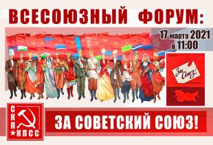 17 марта 2021 года в 11:00 начнёт работу онлайн-форум Союза Коммунистических Партий – КПСС «За Советский Союз!». Он приурочен к 30-летию Всесоюзного референдума о сохранении СССР.