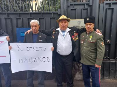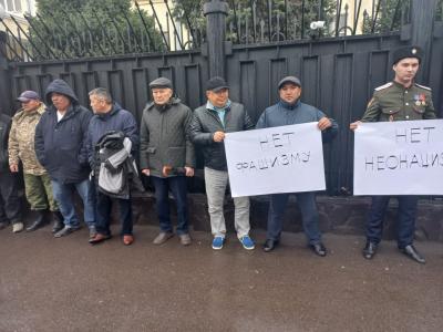 Партия коммунистов Кыргызстана также не побоялась собраться возле здания Посольства Российской Федерации с плакатами «Нет неонацизму», «К ответу нациков», «Кыргызстан с Россией», «Нет фашизму».