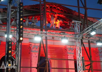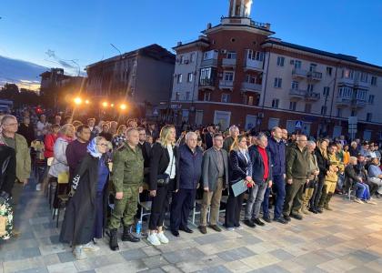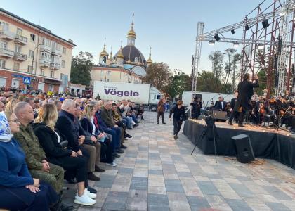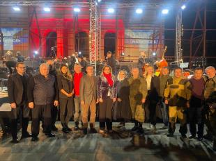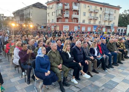 Далее делегация приняла участие в концерте «Во имя жизни- Мариуполь», приуроченного к 79-й годовщине освобождения города от немецко-фашистских захватчиков. Мариуполь - крупный порт на побережье Азовского моря, который в годы Великой Отечественной войны был оккупирован фашистами. 10 сентября 1943 года город был освобожден советскими войсками. Выступление проходило на фоне разрушенного здания театра в Мариуполе. Символичным является место проведения торжественного мероприятия, под открытым чистым небом, перед разрушенным после военных действий зданием драматического театра, который вскоре будет восстановлен, развивались сотни российских флагов.