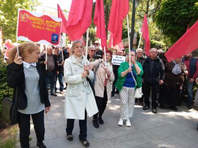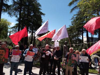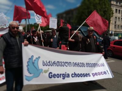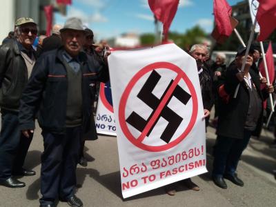 Кроме того, празднующие люди принесли антинатовские и антифашистские плакаты, а также баннер против нацизма на Украине. 9 мая Единая Компартия Грузии отметила День Победы шествием и митингом в столице Грузии Тбилиси.