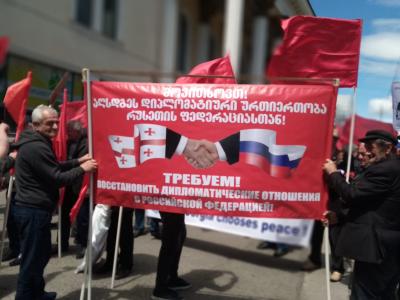 В Тбилиси состоялись мероприятия, посвящённые Дню Великой Победы. Участники акции прошли с красными флагами по центру города. У некоторых были Знамёна Победы, на что полиция не реагировала.