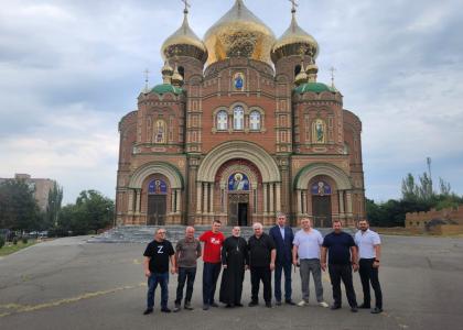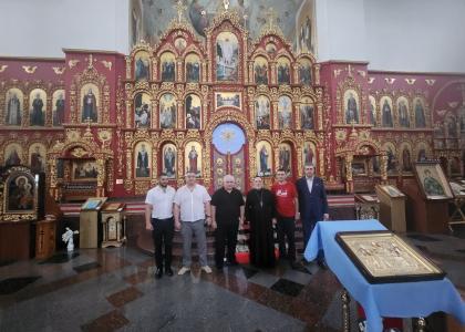 Далее посетили Свято-Владимирский кафедральный собор г. Луганска. С его настоятелем Владимиром Васильевичем Конончуком делегацию связывает давняя и крепкая дружба. В 2014 г., когда Луганск сотрясали взрывы и ежедневно город подвергался обстрелам со стороны укрфашистов, осколками был поврежден главный купол храма. По поручению Зюганова Г.А., Кашина В.И. представители Коммунистической партии незамедлительно откликнулись и нашли средства, чтобы его восстановить.
