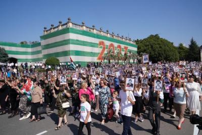 Абхазии, а также подразделения из Южной Осетии. Далее шествовал "Бессмертный полк". Сотни людей вышли с портретами родственников, погибших во время этой страшной, кровопролитной войны.