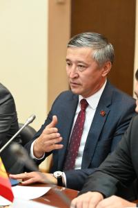 Леонид Иванович поблагодарил киргизскую сторону за высокий уровень организации мероприятий, посвященных 85-летию Парламента Киргизии и мероприятий Межпарламентской Ассамблеии СНГ. Также он отметил, что председательство Киргизии в СНГ было плодотворным и результативным. Далее поговорили о Конституционном законе Кыргызской Республики от 17 июля 2023 года № 140 «О государственном языке Кыргызской Республики», принятие которого создает некоторые трудности для русскоязычного населения Киргизии. Также обсудили уровень образования на русском языке в Кыргызской Республике. Сейчас ведется строительство 9 русских школ в Киргизии. Первую школу планируют открыть уже в 2025 году. Кроме того, Леонид Иванович рассказал, что Комитетом по делам СНГ, Евразийской интеграции и связям с соотечественниками проведена работа по увеличению количества квот на обучение соотечественников на безвозмездной основе в вузах Российской Федерации. В 2023 г. количество выделяемых квот, было увеличено в 2 раза и составило более 30 тысяч мест. Комитет планирует и далее проводить эту работу и увеличить количество квот в 3-4 раза.