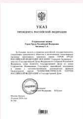 Присвоение Вам звания Героя Труда Российской Федерации – это высочайшее признание Вашего непоколебимого служения народу и Родине. Ваша жизнь – яркий пример преданности идеалам справедливости и социального равенства.