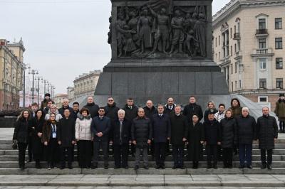 Затем международные наблюдатели приняли участие в торжественной церемонии возложения цветов к Монументу Победы в центре Минска, который был возведён в память о воинах Советской армии, партизанах и подпольщиках, погибших в годы Великой Отечественной войны - одному из символов столицы Беларуси. Возложение цветов к мемориалам, посвященным общей Победе, — традиция, которая соблюдается парламентариями стран Содружества. Особое значение эта акция имеет в наступившем 2025 году, который объявлен в СНГ Годом 80-летия Победы в Великой Отечественной войне – Годом Мира и Единства в борьбе с нацизмом.