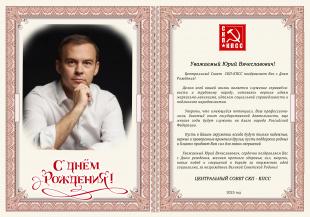 Уважаемый Юрий Вячеславович, сердечно поздравляем Вас с Днем рождения, желаем крепкого здоровья, сил, энергии, новых побед и свершений в борьбе за торжество идей социализма, за возрождение Великой Советской Родины!