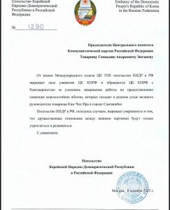 Посольство КНДР в РФ от имени Международного отдела ЦК Трудовой партии Кореи выразило благодарность Председателю ЦК КПРФ Г.А. Зюганову за отправку саженцев в рамках акции «Сад Победы – Сад жизни»