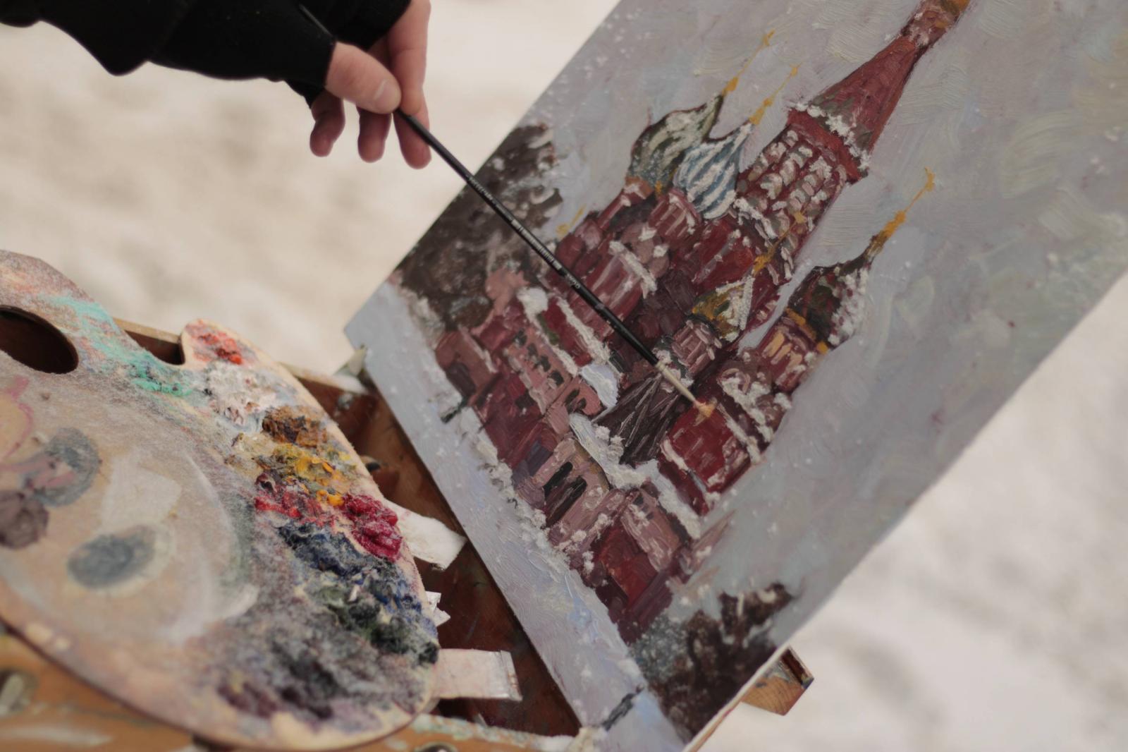 Рождественский день начался особенно светло и спокойно. Утром студенты художественного колледжа вновь вышли на пленэр — на этот раз прямо на главную площадь страны. Рядом с Храмом Василия Блаженного они установили этюдники и погрузились в работу. Морозное утро наполняло пространство прозрачным светом, а заснеженные купола храма словно сами подсказывали ритм и цвет. В эти часы Красная площадь открывалась не как туристический символ, а как живое, одухотворённое пространство — величественное и тихое. В картинах рождалось не просто изображение Москвы, а личное переживание момента, которое останется с ребятами надолго.