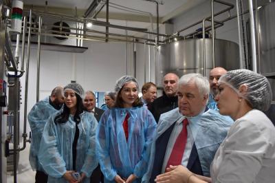 Далее делегация посетила Моздокский гормолзавод – предприятие по переработке молока в станице Луковская. Завод был открыт в 2024 году при поддержке Минсельхоза РСО-Алания и занимается производством молочной продукции – молока, кефира, творога и масла. Сегодня продукция Моздокского гормолзавода поставляется в магазины Северной Осетии и соседних Республик. Директор предприятия Артур Кокаев ознакомил гостей с продукцией завода и процессом производства.