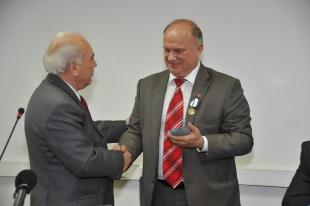 На снимке: первый секретарь ЦК КПА Р.Г. Товмасян вручает Председателю Совета СКП-КПСС Г.А. Зюганову награду за большой вклад в дело укрепления добрососедских отношений между Россией и Арменией.