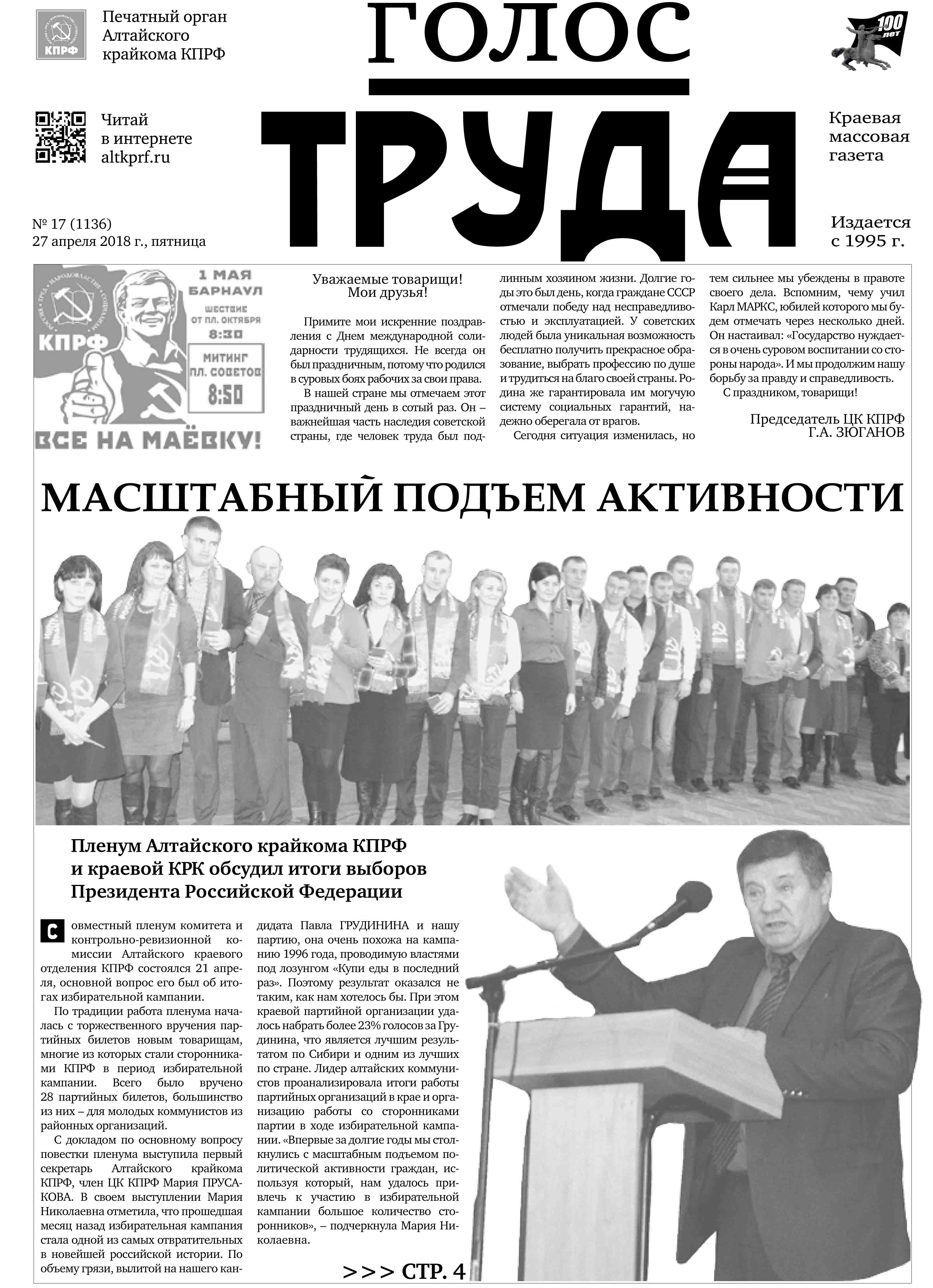 Газета "Голос труда" №17 27 апреля 2018 года