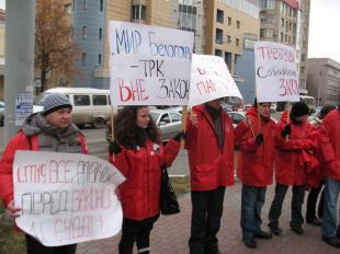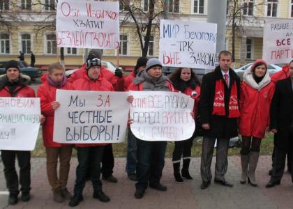 В связи с многочисленными нарушениями со стороны СМИ, в частности ТРК «Мир Белогорья», которая, по мнению коммунистов, ведет прямую агитацию, способствующая формированию отрицательного отношения избирателей к политической партии КПРФ, оскверняющая образ Коммунистической партии и ее кандидатов в депутаты Государственной Думы Федерального собрания Российской Федерации, а также бездействия Областной избирательной комиссии, что противоречит закону, группа комсомольцев, по инициативе депутата Белгородской областной Думы Н.П. Мухинаи кандидата в депутаты Государственной Думы Федерального Собрания РФ шестого созыва А.А. Сычевой 10 ноября провела пикеты у Областной Избирательной комиссии и ТРК «Мир Белогорья». В пикетах также приняли участие кандидат в депутаты Совета депутатов г. Белгорода четвертого созыва по одномандатному избирательному округу №3 Шитиков Д.С и секретарь горкома КПРФ по молодежи Сидоров Я.Н.