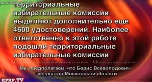 Из которых только 16 тысяч выданы избирателям. 90000 это надо считать, что это все люди, которые должны проголосовать за Владимира Владимировича. Это огромная цифра! И каждый из вас должен узнать, сколько у вас таких людей, получивших открепительные талоны, которые должны голосовать. Из резерва избирательные комиссии Московской области в территориальные избирательные комиссии выделяют дополнительно еще 4600 удостоверений. Наиболее ответственно к этой работе подошли территориальные избирательные комиссии Павловопосадского, Ногинского, Солнечногорского, Шатурского, Красногорского, Нарофоминского районов, в Лобне, Орехово-Зуево, Жуковского, Рошаль, в которых выдано на руки избирателям по-разному, но от 30 до 50 процентов. Это лучше, чем у других. Но это мало. В худшую сторону по данному вопросу отмечаю территориальные избирательные комиссии, с которыми вы должны разобраться, Талдомского, Щелковского, Истринского, Ленинского, Рузского районов и городов Красноармейск, Лосино-Петровский, Фрязино, Троицк, Железнодорожный, Звёздный городок, Химки. Некоторые из вас, я так слышал, чего-то опасаются, вроде того, что здесь что-то незаконно. Здесь всё законно! Не надо ничего бояться. По открепительным талонам и по голосованию на дому. Абсолютно всё законно. У нас Вильданов нет здесь? Надо поставить ему задачу, вот я поручаю Вильданову. Он отвечает за это, он должен проверять, контролировать, организовывать выдачу открепительных талонов. Избирательная комиссия Московской области. Это его работа. Пусть проводит графики, к себе вызывает, сам ездит, своих посылает туда, проверяют, пусть организуют это. Хочу сказать, что по результатам выдачи избирателям открепительных удостоверений, будет оцениваться качество вашей работы, уважаемые главы. По голосованию избирателей вне избирательных участков. Все необходимые разъяснения на этот счет вы получили, всё знаете. До конца следующей недели все открепительные талоны должны быть выданы. Полностью, 100%. Пожалуйста, проконтролируйте. На слово не верьте. Вызывайте этих председателей ТИК, [неразб.] пусть докладывают вам.