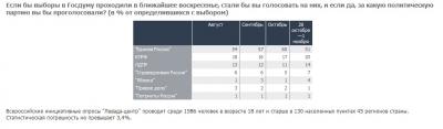 Еще две недели назад (21-24 октября) за партию власти, по данным "Левада-центра", готовы были голосовать 60% из тех, кто точно знает, что придет на выборы, и уже решил, какой партии отдать предпочтение. Но 1 ноября таких было лишь 51% (см. таблицу). По 3% нарастили свой рейтинг КПРФ и ЛДПР. Впрочем, для самих партий такой прирост малозначим при статистической погрешности соцопросов в 3,4%. "Справедливая Россия" вплотную подошла к барьеру 7%, преодолев который сможет вновь создать фракцию в Госдуме. Рейтинг "Яблока" вырос до 4%. "Правое дело" и "Патриоты России" остались на прежних однопроцентных позициях.