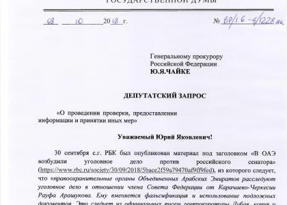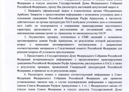Задержанию сенатора предшествовал депутатский запрос члена президиума ЦК КПРФ, первого секретаря МГК КПРФ Валерия Рашкина в Генпрокуратуру, в котором он просил «осуществить проверку изложенных в СМИ сведений о возможном противоправном деянии Рауфа Арашукова, по результатам которой рассмотреть вопрос о вынесении мотивированного постановления о направлении соответствующих материалов в Следственный комитет Российской Федерации для решения вопроса об уголовном преследовании».