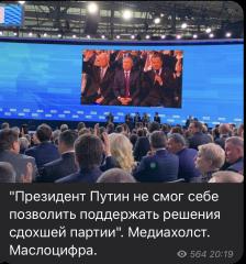1. Итак, на данный момент очевидно, что ритуально побывав на съезде «медведей», президент Путин достаточно все же явно дистанцировался от «ЕР». Один из важных маркеров, - это употребление по отношению к «ЕР» местоимения «вы». Путин часто использовал в выступлении на съезде ЕР словосочетание «вы», «у вас» и так далее, и редко, выборочно использовал слова типа "наши, наших сторонников". Позиционирование: отец «президент всех россиян» остается. Выступление было очень коротким. Это удивило экспертов;