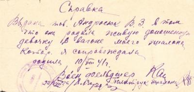 На справке, выданной в поезде, написанный перьевой ручкой текст гласил: «Справка выдана тов. Андросюк В.З. в том, что она родила живую доношенную девочку в вагоне моего эшелона, который я сопровождала. Родила 10.08.41 г.»