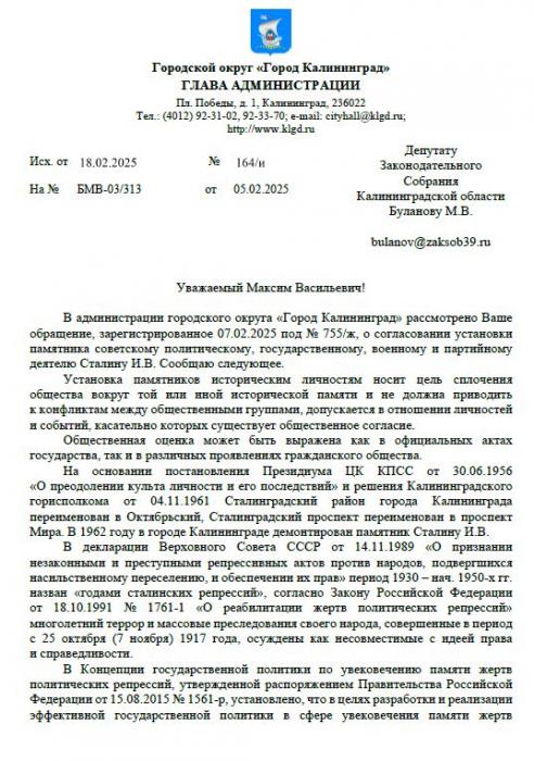 Калининградское областное отделение КПРФ потрясено заявлением главы администрации Калининграда Елены Дятловой, которая в своем отказе на установку памятника И.В. Сталину, сослалась на “сталинские репрессии” и даже приплела “Книгу памяти жертв политических репрессий”. Это не просто отказ, это плевок в лицо ветеранам, труженикам тыла, всем, кто ковал победу под руководством Верховного Главнокомандующего!
