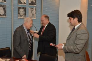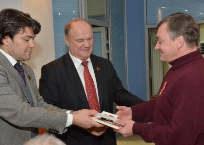 Затем Г.А. Зюганов вручил памятные медали ЦК КПРФ «90 лет СССР» коллективу «Советской России» во главе с главным редактором газеты, депутатом Государственной Думы Валентином Васильевичем Чикиным. Лидер коммунистов поздравил сотрудников редакции с наступающим Новым годом и пожелал им добра и удачи.