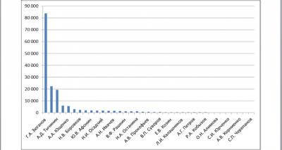 Вместе с тем в количестве подписчиков у партийных деятелей в твиттере наблюдается крайняя неравномерность. Лидер КПРФ Г.А. Зюганов имеет многократно большее количество читателей, чем любой другой участник рейтинга. Более того, Г.А. Зюганов обладает количеством подписчиков, значительно превышающим сумму всех остальных участников рейтинга вместе взятых.