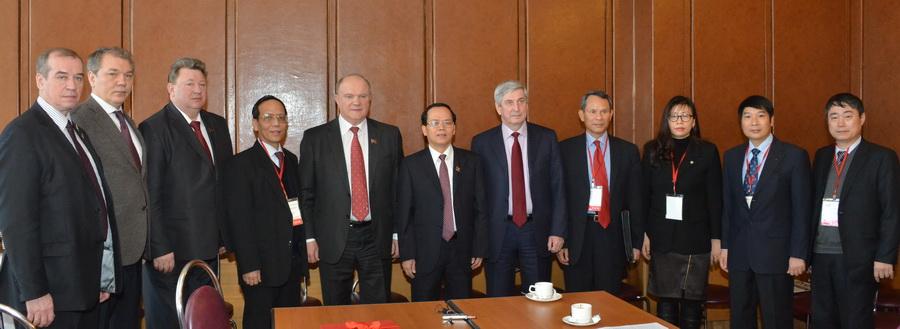 Во встрече приняли участие первый заместитель Председателя ЦК КПРФ И.И. Мельников, заместитель Председателя ЦК КПРФ В.И. Кашин, член Президиума, секретарь ЦК КПРФ Л.И. Калашников, член Президиума ЦК КПРФ С.Г. Левченко, заведующий международным отделом ЦК КПРФ А.П. Филиппов, посол Социалистической Республики Вьетнам в Российской Федерации Фам Суан Шон.