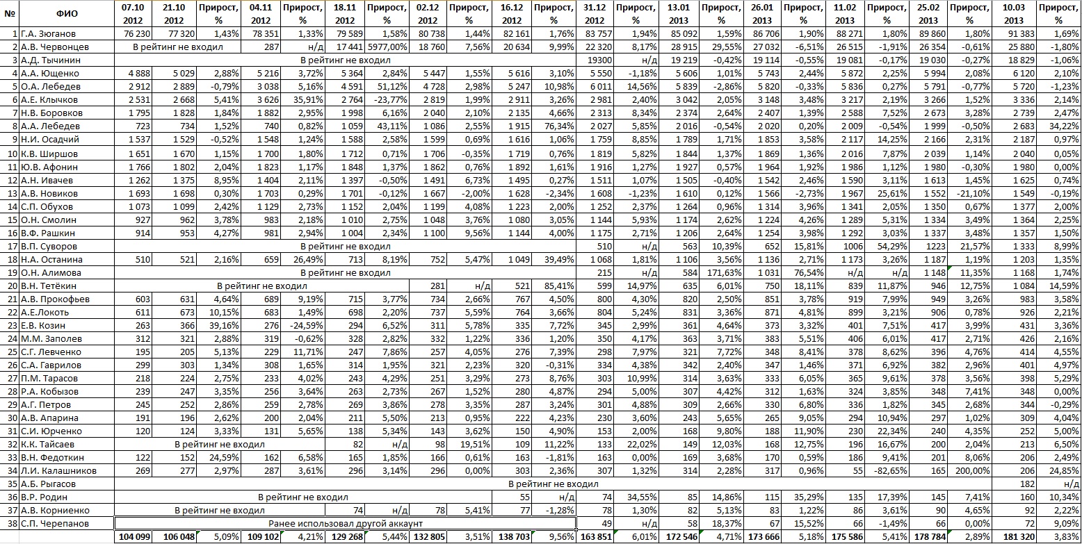 Лидер в рейтинге твиттер-аккаунтов - Председатель ЦК КПРФ Г.А. Зюганов. За полмесяца количество читателей у него возросло на 1 523. Вторую строчку продолжает удерживать аккаунт руководителя группы региональных политтехнологов ЦК КПРФ А.В. Червонцева. Третью строчку рейтинга занимает депутат Государственной Думы А.Д. Тычинин. Сохраняют свои места в первой пятерке А.А. Ющенко и О.А. Лебедев. Наилучшие показатели по относительным темпам прироста количества читателей продемонстрировали: А.А. Лебедев, Л.И. Калашников, В.Н. Тетёкин, В.Р. Родин, С.П. Черепанов, В.П. Суворов, К.К. Тайсаев, П.М. Тарасов, С.И. Юрченко – у указанных товарищей показатель прироста составил более 5%.