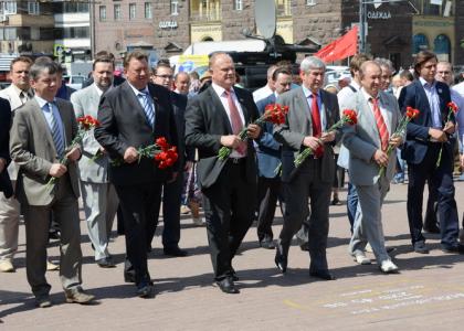 Перед началом мероприятия лидер КПРФ возложил цветы к памятной доске с именами актеров театра, погибших в годы Великой Отечественной войны.