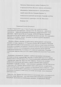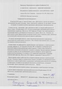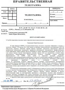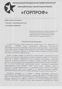 Руководствуясь требованиями статей 7,14 Федерального закона «О статусе члена Совета Федерации и статусе депутата Государственной Думы Федерального Собрания Российской Федерации» прошу Вас в кратчайшие сроки, установленные законом, провести проверку доводов обращения и принять соответствующие меры по восстановлению законности и нарушенных трудовых прав кандидатов в народные депутаты Госсобрания (Ил Тумэн) Республики Саха (Якутия), руководителей независимого регионального профобъединения «Союз работников горной отрасли Якутии» (Горпроф).