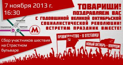 7 ноября 2013 года 2013 года в Москве пройдут шествие и митинг, организуемые ЦК и МГК КПРФ и посвященные 96-й годовщине Великой Октябрьской социалистической революции, за национальное согласие на базе равной ответственности перед законом, в поддержку инициативы фракции КПРФ в Государственной Думе об отставке Правительства РФ, а также за сложения с себя полномочий тех, кто ответственен за провал в государственной политике.